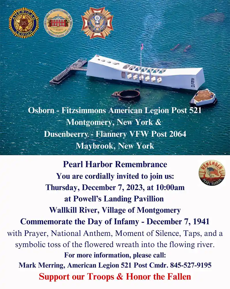 Commemorate the Day of Infamy - December 7, 1941 with Prayer, National Anthem, Moment of Silence, Taps, and a symbolic toss of the flowered wreath into the flowing river. For more information, please call Mark Merring, American Legion 521 Post Cmdr at 527-9195.