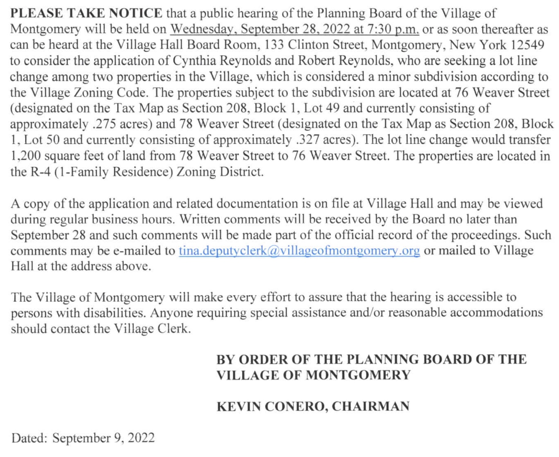 PLEASE TAKE NOTICE, that the Planning Board of the Village of Montgomery will hold a Public Hearing on Wednesday, October 26, 2022, at 7:30 P.M. or as soon thereafter as can be heard at the Village Hall, 133 Clinton Street, Montgomery, NY 12549, to consider the application of Rowley Development Corp., (the “Rowley Railroad Avenue Application”), to permit a 9-lot major subdivision for the construction of 7 two-family dwellings in the R-6 zoning district and a mixed use commercial and residential building with associated improvements in the B-2 zoning district. The public hearing will consider the application for major subdivision approval, site plan approval and special exception use approval, and will also consider the potential adverse environmental impacts associated with the application.