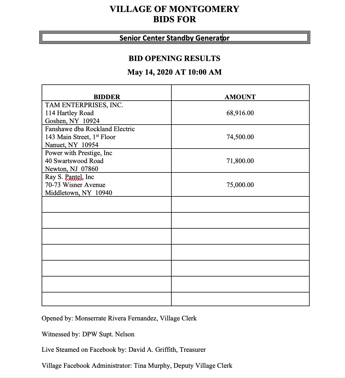 The Senior Center Generator Bid opening is scheduled for May 14, 2020 at 10:00 am, held at the Village Hall. Due to the COVID-19 concerns no public attendance is permitted.